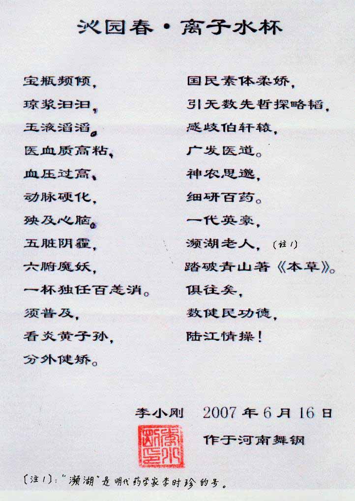 -----我是從事建筑的高工,本來(lái)沒(méi)有資格去攻克醫(yī)學(xué)難題,卻為了自身健康才扣響醫(yī)學(xué)的大門(mén)。由于我1990年患高血壓,因怕中風(fēng)才研究發(fā)明了離子水瓶,我把水處理成微小分子團(tuán)水,飲用后治愈了高血壓。便于1993年底送到三家省級(jí)醫(yī)院做臨床試用4個(gè)月。經(jīng)北京和廣西醫(yī)學(xué)專家鑒定:"降脂降壓效果好"," 能擴(kuò)大心腦動(dòng)脈流量,改善心腦電圖以及微循環(huán)","對(duì)治療心腦動(dòng)脈粥樣硬化、高血壓、高血脂有良好的醫(yī)療保健作用。""產(chǎn)品的技術(shù)性能和療效達(dá)到了同類(lèi)產(chǎn)品的國(guó)內(nèi)領(lǐng)先水平,經(jīng)廣西醫(yī)學(xué)科學(xué)情報(bào)研究所檢索,未見(jiàn)國(guó)外有類(lèi)似報(bào)道。"中國(guó)醫(yī)學(xué)科學(xué)院張正國(guó)教授從美國(guó)國(guó)立醫(yī)學(xué)圖書(shū)館數(shù)據(jù)庫(kù)存Medline檢索英俄文資料,均未見(jiàn)類(lèi)似報(bào)告。2000年上市后,我為了對(duì)消費(fèi)者負(fù)責(zé)而繼續(xù)觀察研究,一直通過(guò)《信譽(yù)卡》和《質(zhì)量跟蹤調(diào)查書(shū)》向患者承諾療效,請(qǐng)用戶使用6個(gè)月后反饋效果。和脂壓患者飲用2至5個(gè)月內(nèi),消除癥狀,停服藥物,血壓正常;冠心病患者飲用3~5個(gè)月逐漸減輕至消除心絞痛、房顫等癥狀,不再服藥,飲用1年左右心電圖正常,經(jīng)冠脈造影掃描無(wú)明顯狹窄,表明冠心病痊愈。大量患者還反映許多衰弱器官被修復(fù),讓前列腺增生、慢性咽喉炎、慢性氣管炎、支氣管炎、慢性胃炎、腸炎和膽囊炎等不藥而愈;2型糖尿病患者是因?yàn)橐葝u衰弱致病,飲用該水半年至一年,逐漸減藥至停藥,血糖尿糖正常,真正治愈2型糖尿病。中風(fēng)后遺癥患者飲用六七個(gè)月,可逐漸減輕至消除肢體和語(yǔ)言障礙,表明飲用該水能讓壽命很長(zhǎng)的神經(jīng)元細(xì)胞逐漸修復(fù),奇跡般地恢復(fù)肢體和語(yǔ)言功能。飲用后還使胸腺和脾臟兩個(gè)重要的免疫器官被修復(fù)和增強(qiáng),產(chǎn)生免疫細(xì)胞多,提高了免疫力,使人不生病或少生病。自此, 飲用微小分子團(tuán)水創(chuàng)造了攻克冠心病、高(低)血壓和糖尿病三大醫(yī)學(xué)難題的奇跡。人們對(duì)此感到不可思議,但實(shí)踐是檢驗(yàn)真理的唯一標(biāo)準(zhǔn)。